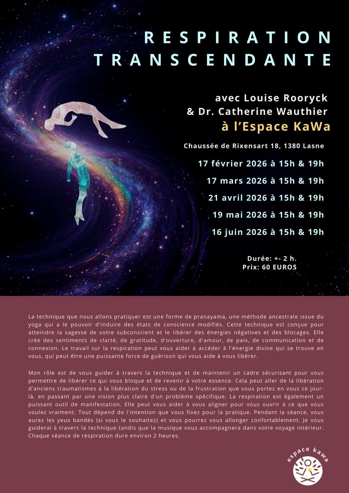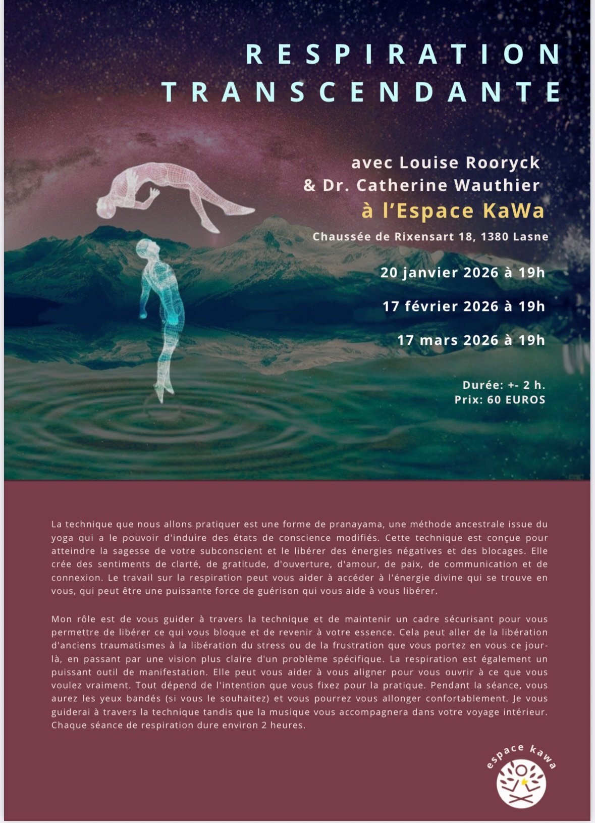 Pour info : respiration transcendante , c est le principe de la respiration holotropique , où comment entrer en état modifié de conscience par la simple respiration (soutenue par la musique). C est une joie d avoir avec nous Louise Rrk, par ailleurs formée par Dr Gabor Mate.. et une joie d accueillir Loli et Luis dont la musique vient d ailleurs.